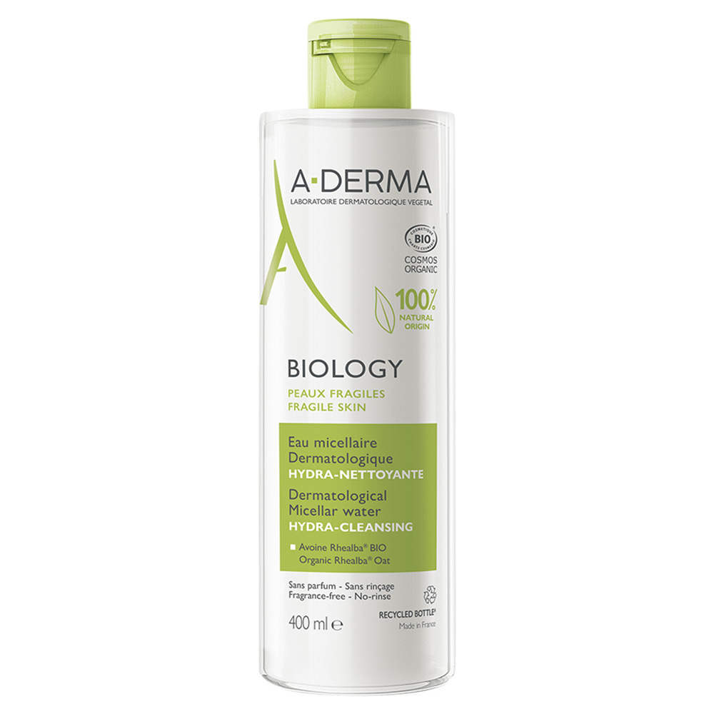 Νερό ντεμακιγιάζ με μικύλλια Biology Eau Micellaire Dermatologique της Α-Derma για πρόσωπο και μάτια, ένα πιστοποιημένο βιολογικό προϊόν, με 100% συστατικά φυσικής προέλευσης.