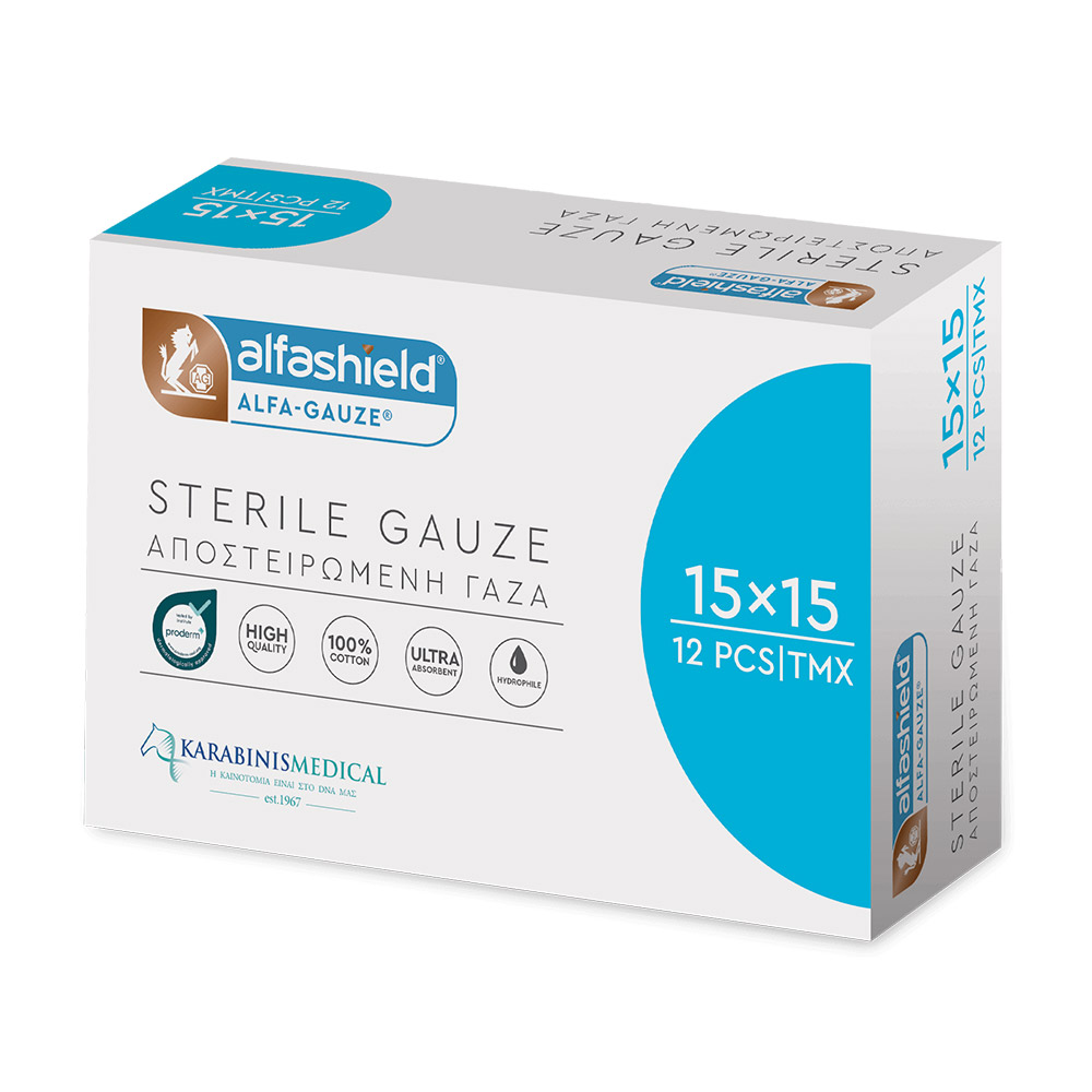 Αποστειρωμένες γάζες AlfaShield, που κατασκευάζονται από 100% άριστης ποιότητας βαμβάκι για μέγιστη ασφάλεια και προστασία. Είναι υδρόφιλες, μεγάλης απορροφητικότητας, άοσμες, χωρίς κατάλοιπα λεύκανσης και με διπλωμένα άκρα.