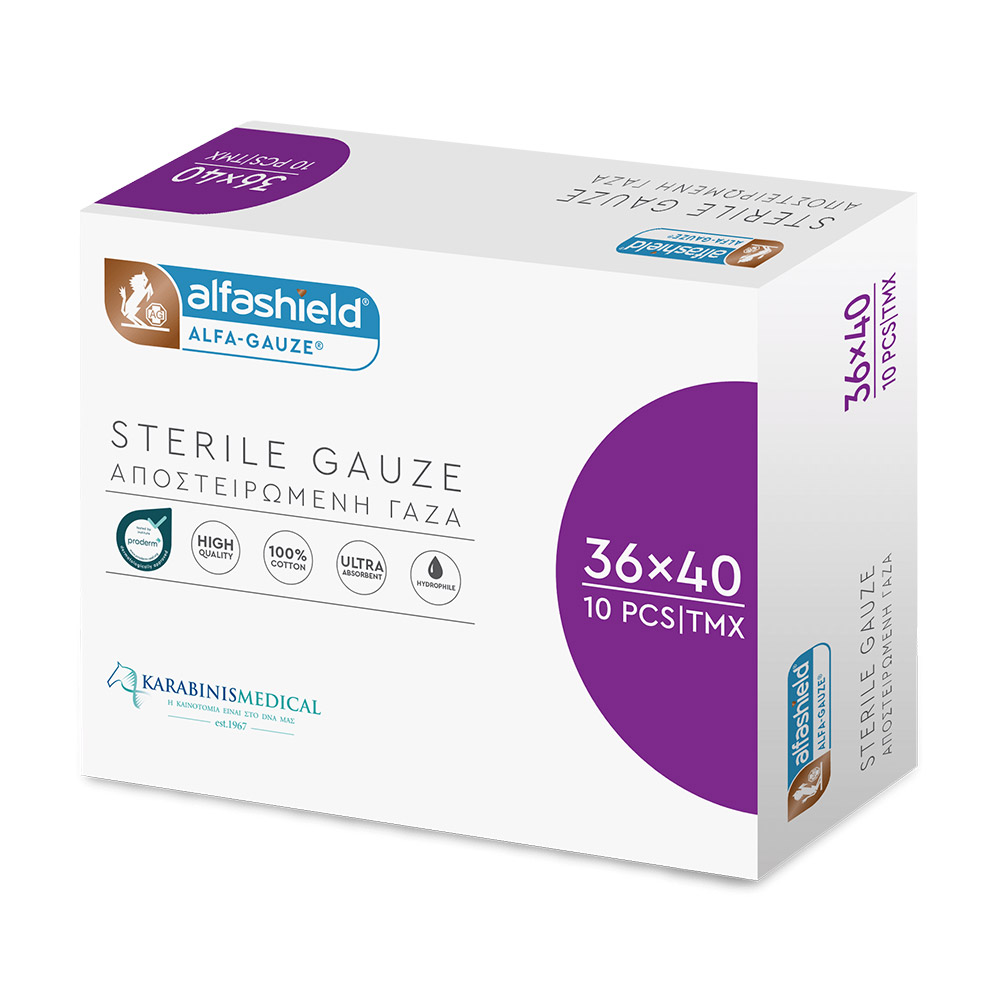 Αποστειρωμένες γάζες AlfaShield, που κατασκευάζονται από 100% άριστης ποιότητας βαμβάκι για μέγιστη ασφάλεια και προστασία. Είναι υδρόφιλες, μεγάλης απορροφητικότητας, άοσμες, χωρίς κατάλοιπα λεύκανσης και με διπλωμένα άκρα.