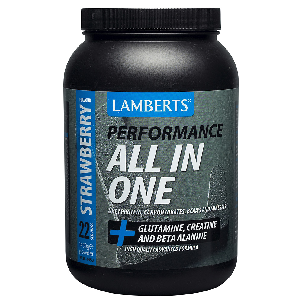 Η ALL-IN-ONE Sports Shake με γεύση φράουλα της Lamberts ® αποτελεί ένα από τα κορυφαία All-In-One προϊόντα αθλητικής διατροφής του καθώς παρέχει ανά 65 g δόσης (περίπου 2 scoops): 38g υψηλής ποιότητας και καθαρότητας πρωτεΐνη ορού γάλακτος (μίγμα Whey Concetrate και Whey Isolate), 19 g υδατάνθρακες, 6 g Γλουταμίνης, υψηλά επίπεδα (6 g) Μονοϋδρικής Κρεατίνης, 6 g από τα Αμινοξέα Διακλαδιζόμενης Αλύσου (BCAA`S). Η ALL-IN-ONE Sports Shake συνδυάζεται ιδανικά με το Multi Guard ® Sport της Lamberts ® και μπορεί να χρησιμοποιηθεί πριν την έναρξη του προγράμματος εκγύμνασης για αύξηση της αντοχής, μετά το πέρας του προγράμματος εκγύμνασης για επιτάχυνση της αποκατάστασης ή σαν ένα πλήρες υποκατάστατο γεύματος. Η σκόνη είναι εύκολα διαλυτή και με ευχάριστη γεύση σοκολάτας.