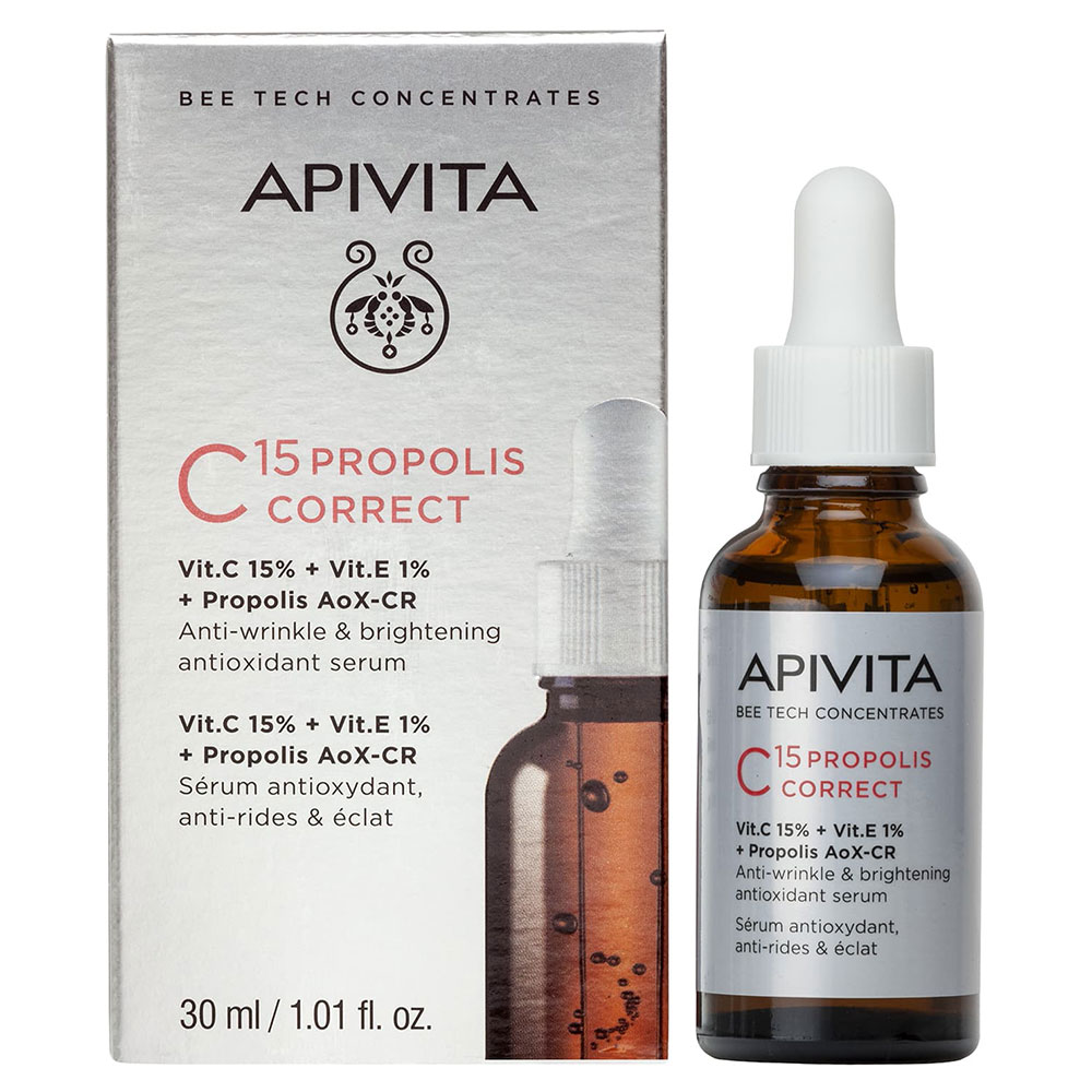 Ο Apivita C15 Propolis Correct Serum είναι ένας προηγμένος, καθημερινός ορός λάμψης & αντιοξειδωτικής προστασίας. Συνδυάζει υψηλή συγκέντρωση σταθεροποιημένης βιταμίνης C (15%) με βιταμίνη E (1%) και το πατενταρισμένο σύμπλοκο Propolis AoX-CR της Apivita, για ενισχυμένη άμυνα από το οξειδωτικό στρες και πιο ομοιόμορφη, φωτεινή όψη.