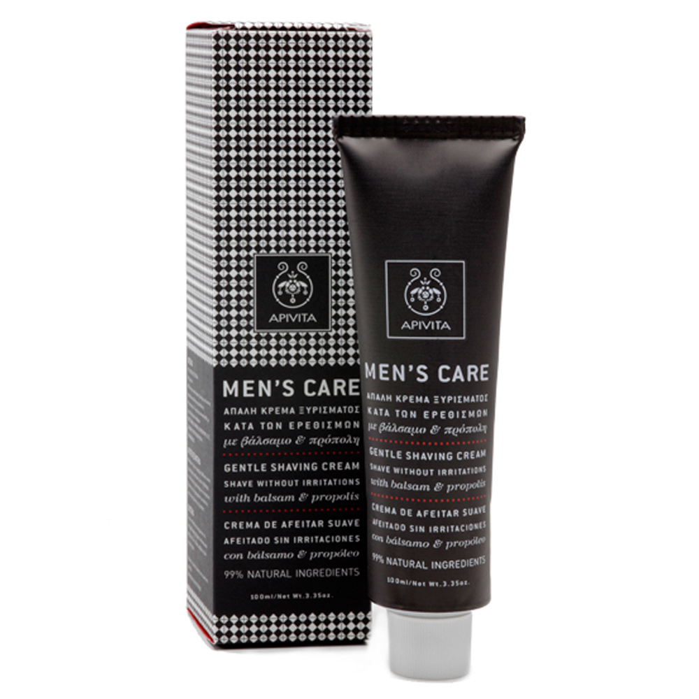 Η Απαλή Κρέμα Ξυρίσματος Κατά Των Ερεθισμών με βάλσαμο και πρόπολη της σειράς Men’s Care της Apivita, χάρη στο σαμπούκο, το βάλσαμο, το εκχύλισμα καλέντουλας και το μελισσοκέρι, μαλακώνει τα γένια και προσφέρει βαθύ και εύκολο ξύρισμα χωρίς ερεθισμούς. Περιέχει επίσης πρόπολη, η οποία με τις ήπιες αντισηπτικές και στυπτικές ιδιότητές της προστατεύει την επιδερμίδα. Το προϊόν δεν περιέχει χημικά συστατικά που έχουν κατηγορηθεί για αρνητικές επιδράσεις στην υγεία ή το περιβάλλον.
