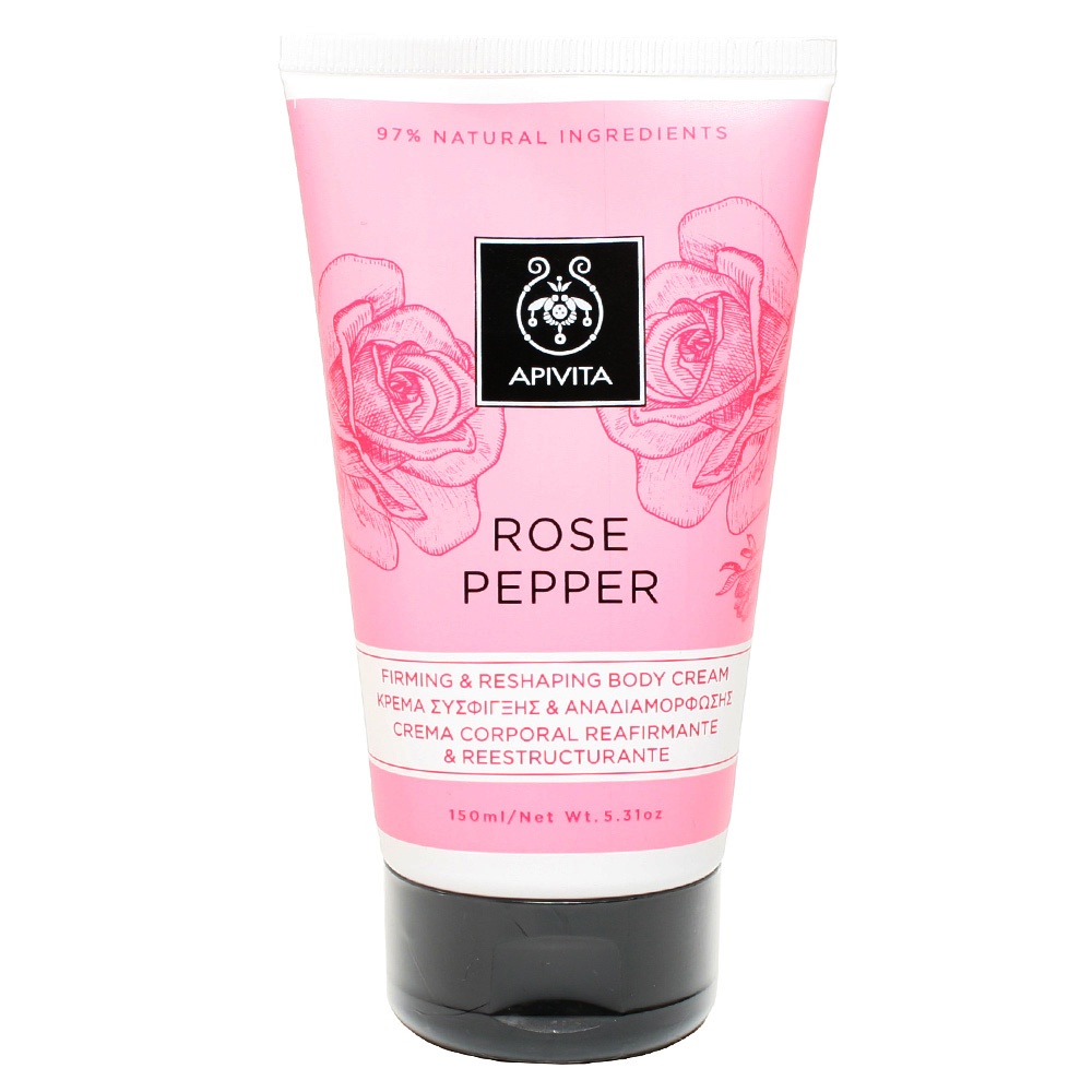 Η κρέμα σύσφιξης και αναδιαμόρφωσης σώματος Rose Pepper της Apivita είναι ιδανική για την καθημερινή περιποίηση της επιδερμίδας. Περιέχει συσφικτικά και ενυδατικά συστατικά όπως έγχυμα αγγινάρας για αποσυμφόρηση, πράσινο καφέ, κισσό και σεντέλα για μείωση πόντων και τοπικού πάχους, ενυδατικό σύμπλεγμα με ελληνικό θυμαρίσιο μέλι, έλαιο αμυγδάλου, προβιταμίνη Β5, μενθόλη, αλλαντοϊνη, αλλά και αιθέρια έλαια τριαντάφυλλου, αγριοκυπάρισσου και μαύρου πιπεριού.