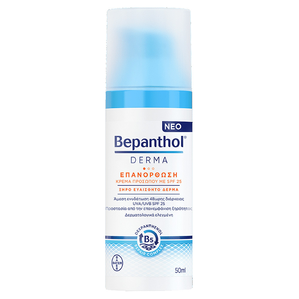 Το ειδικό Σύμπλεγμα Επανόρθωσης Repair Complex περιέχει θρεπτικά συστατικά που συμβάλλουν στην αναζωογόνηση της ξηρής επιδερμίδας. Ως μέρος της νέας σειράς προϊόντων περιποίησης της επιδερμίδας Bepanthol® Derma Κρέμα Προσώπου με SPF25 για Επανόρθωση όχι μόνο καταπραΰνει άμεσα το ξηρό δέρμα, αλλά προσφέρει και μια πιο μακροπρόθεσμη λύση στη διατήρηση της υγείας του δέρματος, αφήνοντάς το λείο και απαλό. Με σύνθεση βασισμένη στην επιστήμη της δερματολογίας, η Bepanthol® Derma περιέχει έναν ειδικό συνδυασμό συστατικών που δρουν βαθύτερα στο δέρμα ενεργώντας στη βασική αιτία της ξηρότητας και επανορθώνοντας το δέρμα «από μέσα προς τα έξω» (inside – out):