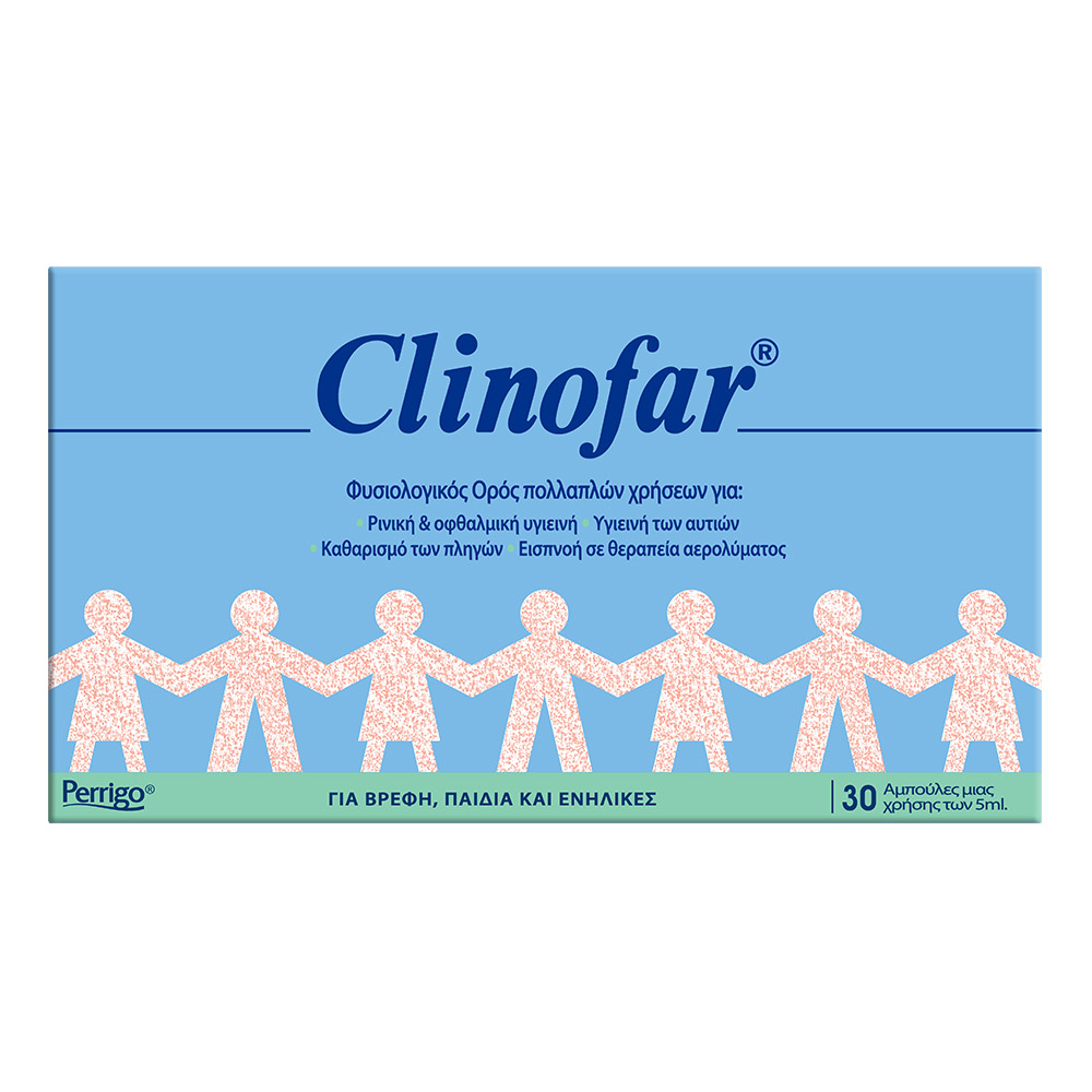 Ο φυσιολογικός ορός Clinofar περιέχει 30 πλαστικές αμπούλες σε μονοδόσεις των 5ml. Aποστειρωμένος και έτοιμος για χρήση ενδείκνυται για την υγιεινή της μύτης και του εξωτερικού των ματιών. Μπορεί να χρησιμοποιηθεί καθημερινά από βρέφη, παιδιά και ενήλικες. Σημαντική επικουρική βοήθεια στην περίπτωση κοινού κρυολογήματος, γρίπης που έχουν ως αποτέλεσμα την ρινική απόφραξη και την ρινική καταρροή. Καθαρίζει την μπουκωμένη μύτη, απομακρύνοντας την πλεονάζουσα βλέννη και διατηρεί τις ρινικές διόδους καθαρές και υγρές