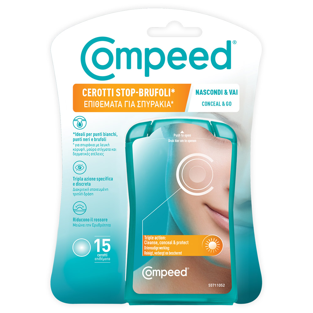 Compeed Conceal & Go (15 τεμάχια) Ιδανικό για την αντιμετώπιση σπυριών, μαύρων στιγμάτων, ατελειών με Τριπλή δράση: καθαρισμός, κάλυψη, προστασία