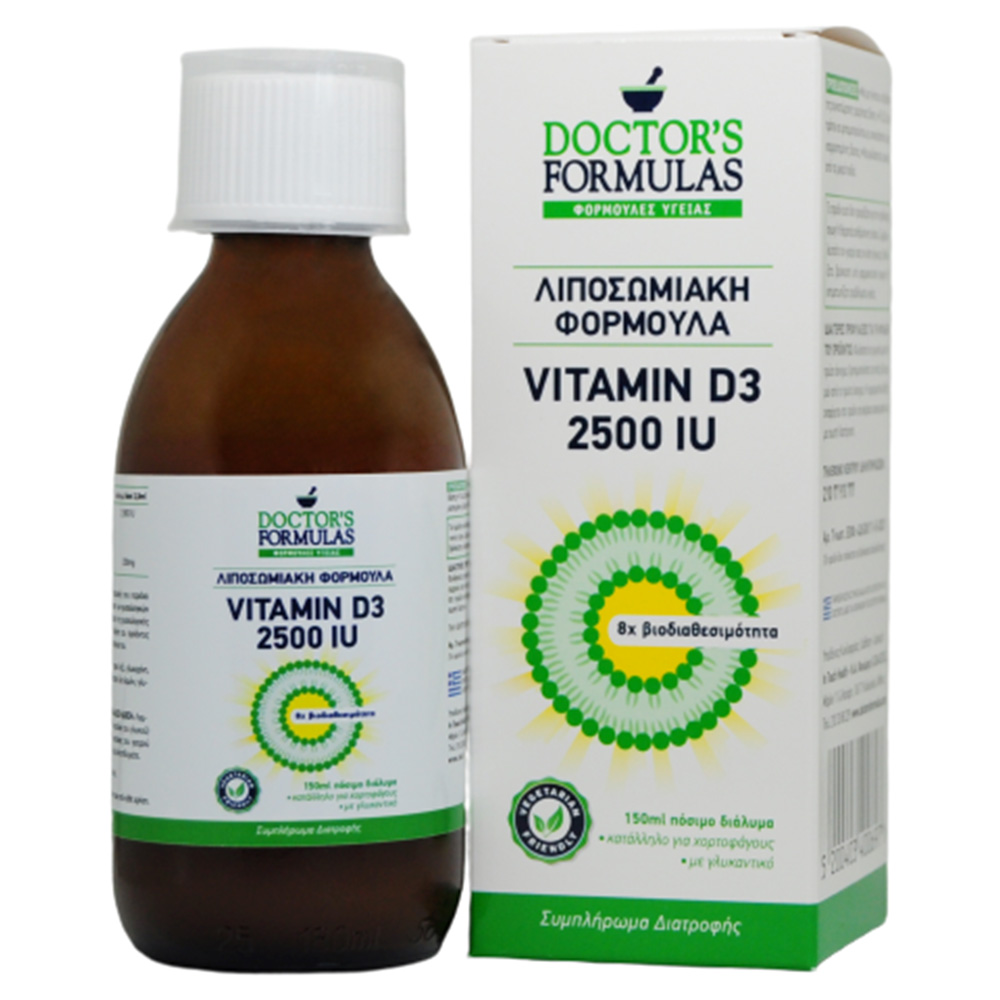 Η Λιποσωμιακή Φόρμουλα VITAMIN D3 2500IU της DOCTOR’S FORMULAS είναι ένα συμπλήρωμα διατροφής που περιέχει 2500 μονάδες βιταμίνης D3 (ως χοληκαλσιφερόλη) η οποία συμβάλλει στη διατήρηση των φυσιολογικών επιπέδων ασβεστίου στο αίμα και στη φυσιολογική κατάσταση των οστών.