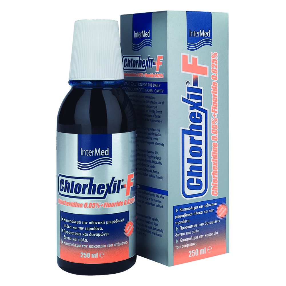 Το Chlorhexil-F Mouthwash είναι φθοριούχο στοματικό διάλυμα, με ήπια αντισηπτική δράση για την καθημερινή υγιεινή περιποίηση της στοματικής κοιλότητας, τον αποτελεσματικό έλεγχο της ουλοοδοντικής μικροβιακής πλάκας, τη ενδυνάμωση της αδαμαντίνης των δοντιών και την ενεργοποίηση του αμυντικού συστήματος των ούλων χάρη στη ποικιλία βοτάνων που υπάρχουν στη σύνθεσή του.