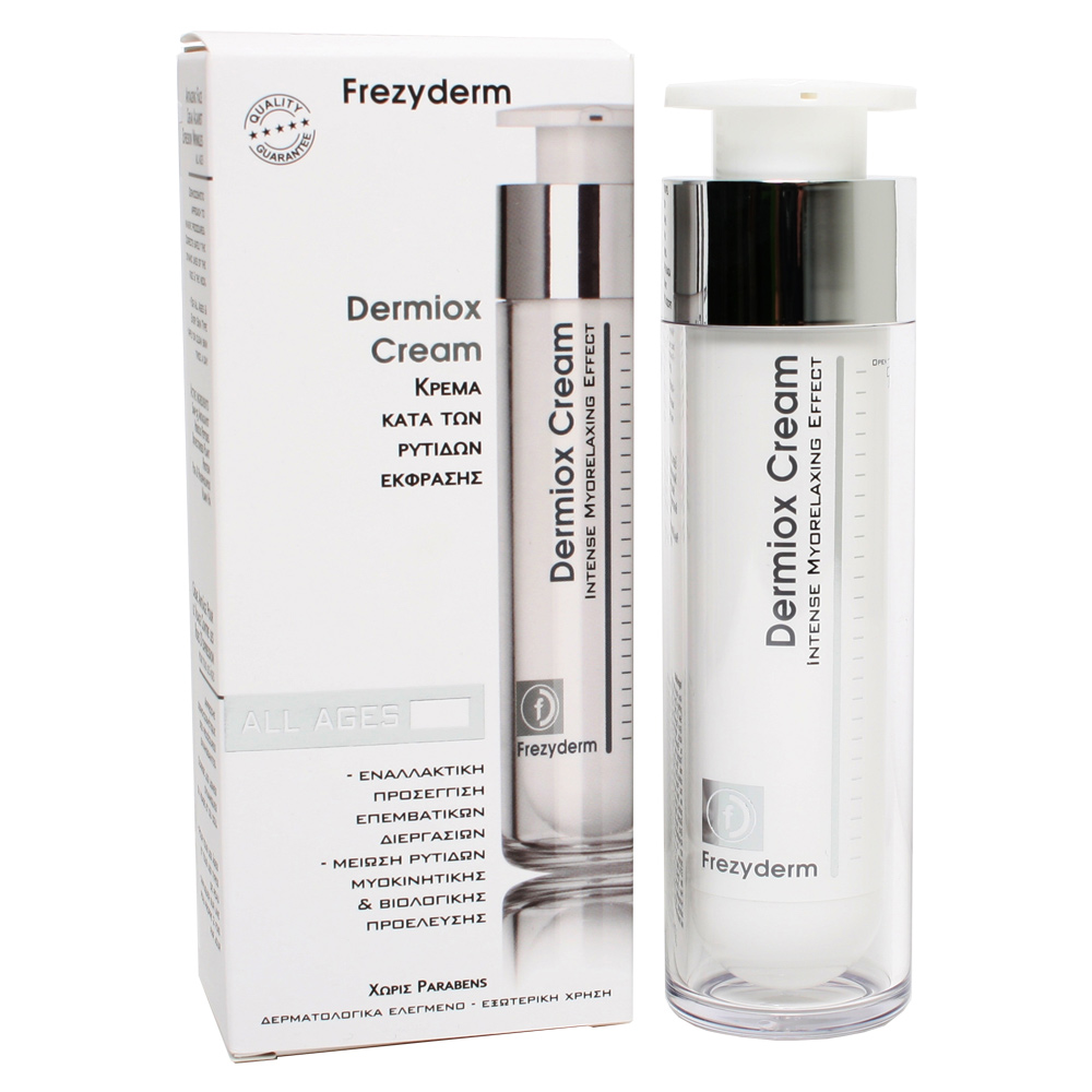 Ενισχυμένη κρέμα Frezyderm Dermiox Cream που μειώνει τις ρυτίδες, στατικές ή έκφρασης, που έχουν εμφανιστεί στο πρόσωπο (μέτωπο, μεσόφρυδο, “πόδι της χήνας”, γύρω από το στόμα και τη μύτη, περίγραμμα χειλιών) και το λαιμό. Χάρη στα φυτικά εκχυλίσματα που περιέχει, έχει μυοχαλαρωτική δράση ανάλογης αποτελεσματικότητας ενέσιμων επεμβατικών διεργασιών (botulinum toxin) και απαλύνει τις ρυτίδες έκφρασης σε βάθος και σε έκταση. Παράλληλα, θρέφει, επουλώνει και ενυδατώνει σε βάθος. Έτσι, οι ρυτίδες μειώνονται και η επιδερμίδα γίνεται και πάλι φρέσκια, νεανική και λαμπερή, χωρίς σημάδια γήρανσης.