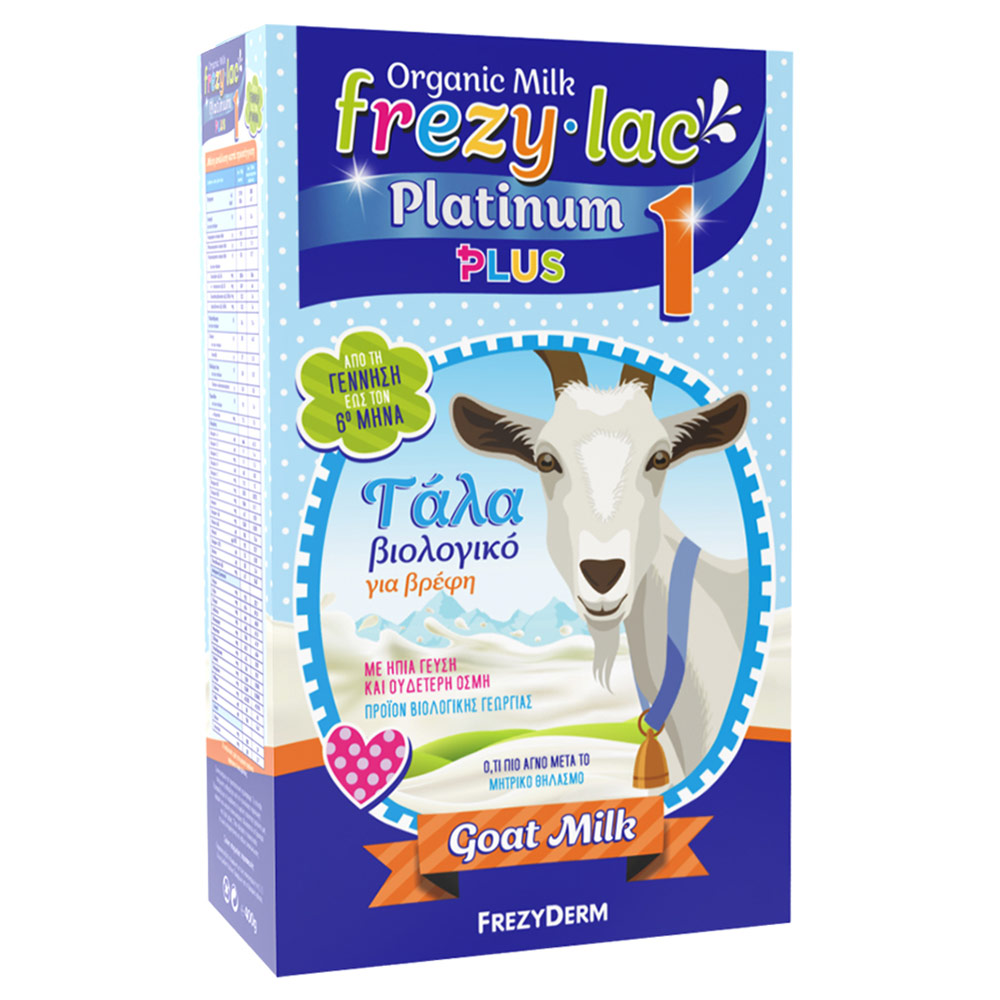 Το Frezyderm Frezylac Platinum Plus 1 είναι βιολογικό γάλα 1ης βρεφικής ηλικίας, σχεδιασμένο για να καλύπτει τις διατροφικές ανάγκες των βρεφών από τη γέννηση. Παρασκευάζεται από πιστοποιημένο βιολογικό κατσικίσιο γάλα και συμμορφώνεται με τις ισχύουσες ευρωπαϊκές προδιαγραφές για τα βρεφικά γάλατα.