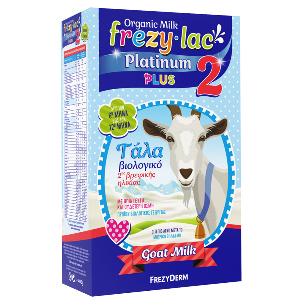 Το Frezyderm Frezylac Platinum Plus 2 είναι βιολογικό γάλα συνέχειας, σχεδιασμένο για βρέφη μετά τον 6ο μήνα, στο πλαίσιο μιας μικτής και ισορροπημένης διατροφής. Παρασκευάζεται από πιστοποιημένο βιολογικό κατσικίσιο γάλα και συμμορφώνεται με τις ευρωπαϊκές προδιαγραφές για τα γάλατα 2ης βρεφικής ηλικίας.