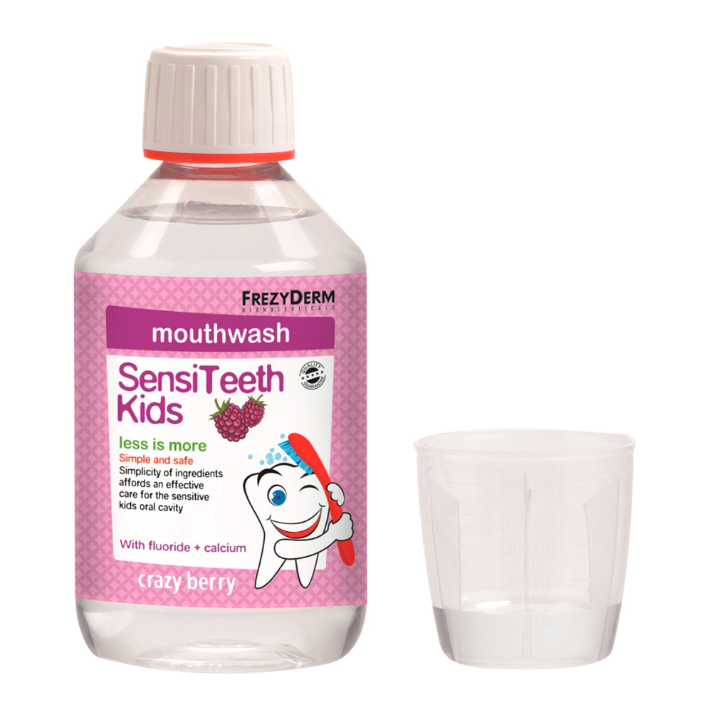 Στοματικό διάλυμα Frezyderm Sensiteeth Kid’s Mouthwash για παιδιά από 3+ ετών που προστατεύει από την τερηδόνα, τα μικρόβια και τους ερεθισμούς των ούλων, ενισχύει το σμάλτο των δοντιών και εξασφαλίζει γερά δόντια χωρίς σφραγίσματα! Δεν περιέχει αλκοόλη, χρώμα, σάκχαρη, σακχαρίνη ενώ έχει ευχάριστη γεύση βατόμουρου
