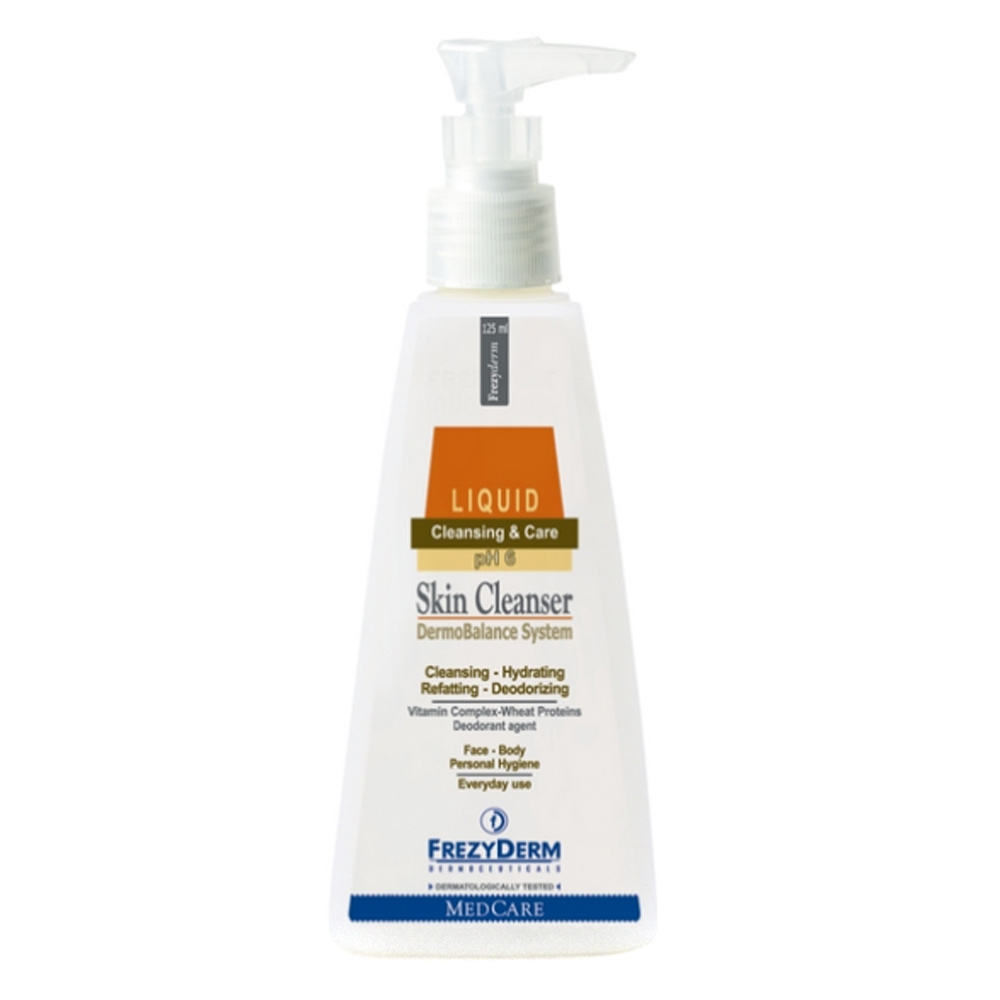 Κλασσικό καθαριστικό προσώπου και σώματος Frezyderm Skin Cleanser με ήπια αντισηπτική δράση, σε υγρή μορφή. Περιέχει ήπια μαλακτικά, επιφανειοδραστικά, και ενυδατικά συστατικά τα οποία προσφέρουν αποτελεσματικό καθαρισμό και περιποίηση της επιδερμίδας. Με επιπλέον ήπια αντισηπτική δράση, χάρη στο Triclosan που περιέχει.