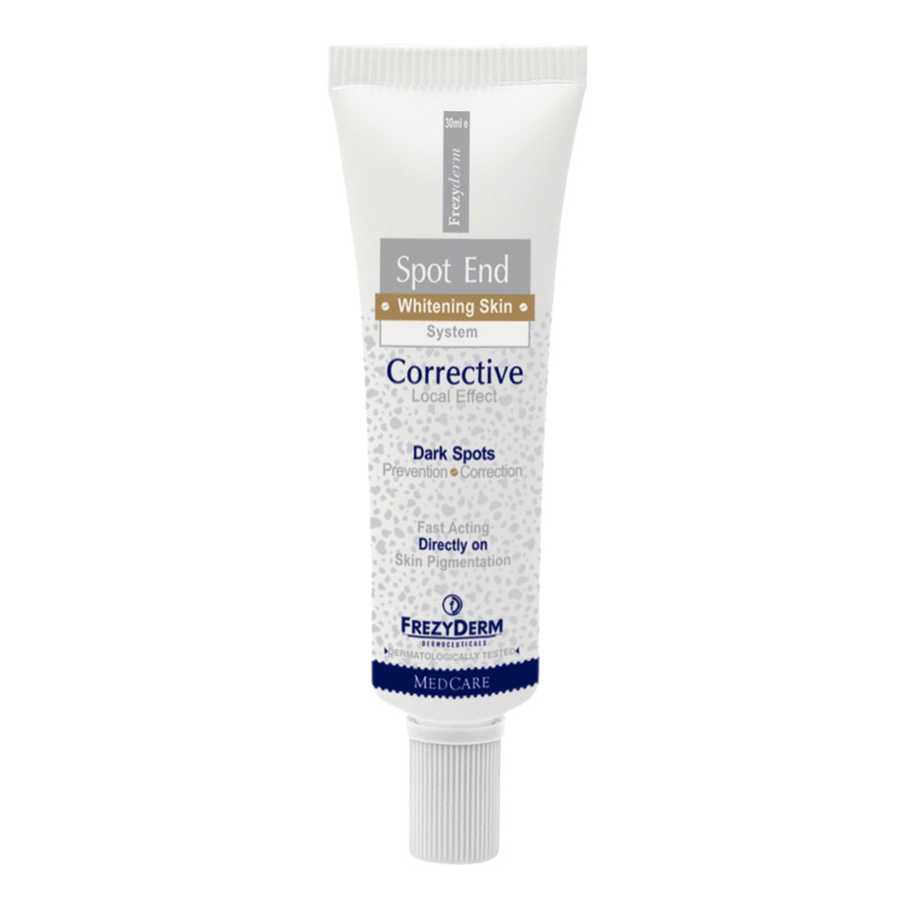 Πολυδύναμη λευκαντική κρέμα τοπικής εφαρμογής Frezyderm Spot End Corrective για άμεση και ταχεία δράση σε πρόσωπο, λαιμό, ντεκολτέ και χέρια. Ο συνδυασμός συστήματος λεύκανσης (DAB, α-αρβουτίνη Kojic acid) και συμπλέγματος κερατολυτικών ενεργών, μειώνει την παραγωγή της μελανίνης και αποχρωματίζει τις καφέ κηλίδες. Έρευνες έχουν δείξει ότι με τη χρήση της κρέμας για 2 μήνες, παρατηρείται αύξηση της λεύκανσης κατά 71% και μείωση των περιοχών με δυσχρωμίες κατά 54%.