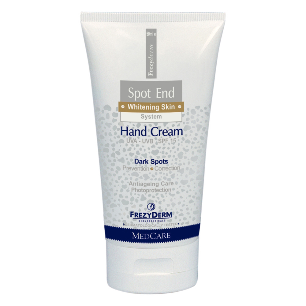 Κρέμα Frezyderm Spot End Hand Cream για αντιμετώπισης των μαύρων κηλίδων και αντιηλιακή προστασία στα χέρια. Συνδυασμός ενεργών λευκαντικών, φίλτρων UVA-UVB νέας γενιάς, βιταμίνης Ε, υαλουρονικού οξέος και Oleoeuropeine που προλαμβάνει τις δυσχρωμίες, ενυδατώνει και βελτιώνει την ελαστικότητα των χεριών. Αντιμετωπίζει κηλίδες γήρανσης, κηλίδες από τον ήλιο και κηλίδες από τη χρήση φαρμάκων ενώ μειώνει τη παραγωγή των καφέ κηλίδων κατά 83% (μέτρηση φασματοφωτομετρική 450nm).