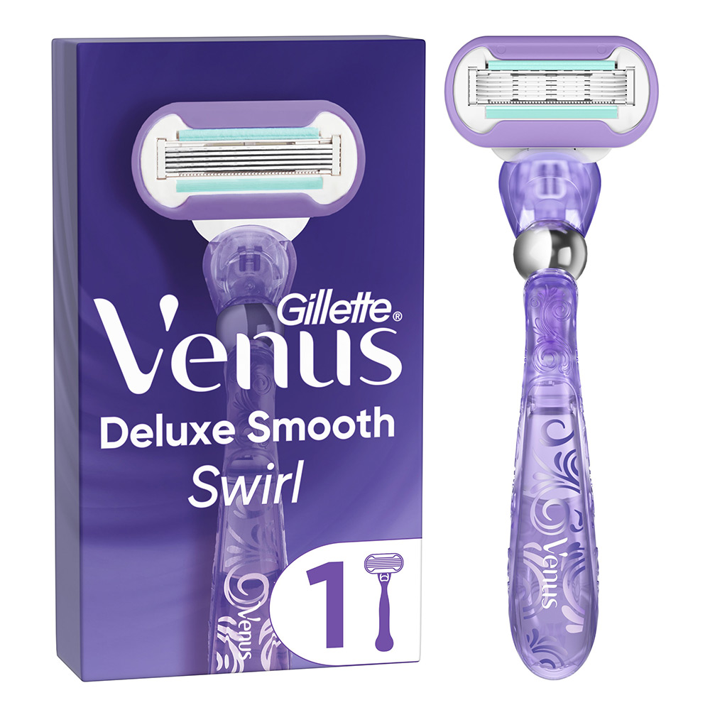 Γυναικείο ξυραφάκι Venus Deluxe Smooth Swirl της Gillette που διαθέτει 5 λεπίδες για εξαιρετικά βαθύ ξύρισμα και λιπαντική ταινία 360ᵒ γύρω που ενεργοποιείται με το νερό και προσφέρει έξτρα προστασία από τις χαρακιές και τα κοψίματα.