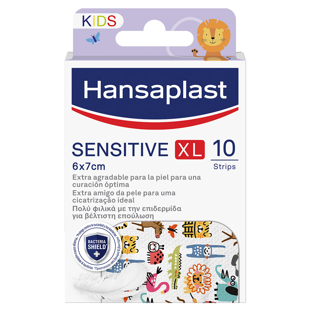 Hansaplast Sensitive XL Kids 10τμχ: επιθέματα extra-μεγέθους σχεδιασμένα ειδικά για ευαίσθητο δέρμα παιδιών. Υποαλλεργικά, εύκαμπτα, με απορροφητικό pad που δεν κολλά στην πληγή.