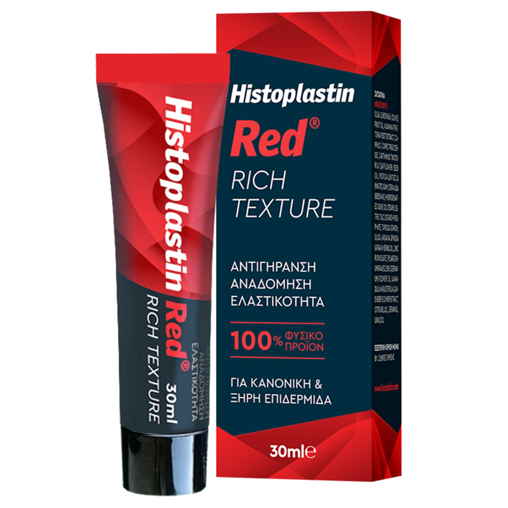 Η Histoplastin Red Rich Texture είναι ένα καλλυντικό προϊόν επιστημονικής έρευνας για την αναδόμηση και αναγέννηση της όψης της επιδερμίδας του προσώπου. Είναι 100% φυσικό προϊόν, κατάλληλο για κάθε ηλικία. Χρησιμοποιείται πρωί -βράδυ για πρόληψη και αντιμετώπιση της καθημερινής φθοράς και γήρανσης της επιδερμίδας. Ανανεώνει το πρόσωπο, αναδεικνύοντας τη φυσική του ομορφιά. Δημιουργεί την ιδανική βάση για makeup, καθώς προσφέρει εντατική ενυδάτωση.