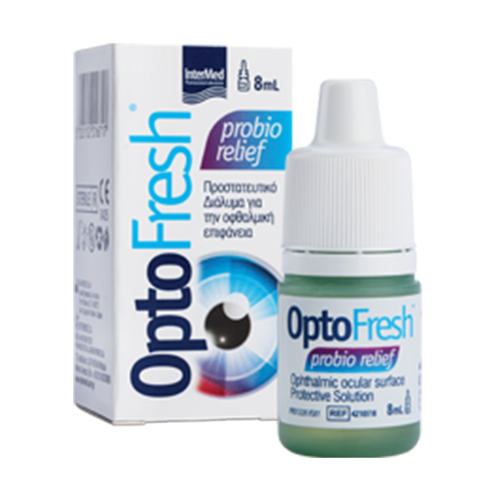 Το OptoFresh probio relief είναι προστατευτικό διάλυμα για την οφθαλμική επιφάνεια, το οποίο περιέχει μίγμα φωσφολιπιδίων από βακτηριακό λύμα του Lactobacillus sakei σε 4% και υδροξυπροπυλομεθυλοκυτταρίνη 0,3%. Χάρη στα φωσφολιπίδια φυσικής προέλευσης και στην ενυδατική υπρομελλόζη που περιέχει, σταθεροποιεί και αποκαθιστά το δακρυϊκό φιλμ έναντι εξωτερικών μικροβιακών παραγόντων, ξηροφθαλμίας, λοιμώξεων (επιπεφυκίτιδα, βλεφαρίτιδα, βλεφαροεπιπεφυκίτιδα και χαλάζιο) ή σε χειρουργικές επεμβάσεις.