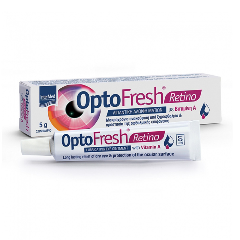 Λιπαντική αλοιφή ματιών OptoFresh Retino Lubricating Eye Ointment με βιταμίνη Α της Intermed, κατάλληλη για ανακούφιση από την ξηροφθαλμία αλλά και την μακροχρόνια προστασία της οφθαλμικής επιφάνειας.