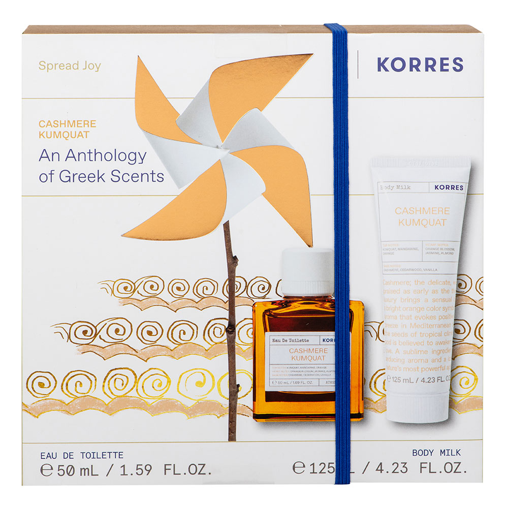 Γυναικείο σετ Korres Cashmere Kumquat με Eau de Toilette 50ml και Body Milk 125ml. Γλυκό-φρουτώδες άρωμα με νότες μανταρινιού, πορτοκαλιού και μανόλιας, σε αρμονία με απαλό ξυλώδες cashmere. Συνοδεύεται από ενυδατικό γαλάκτωμα σώματος με βελούδινη υφή.
