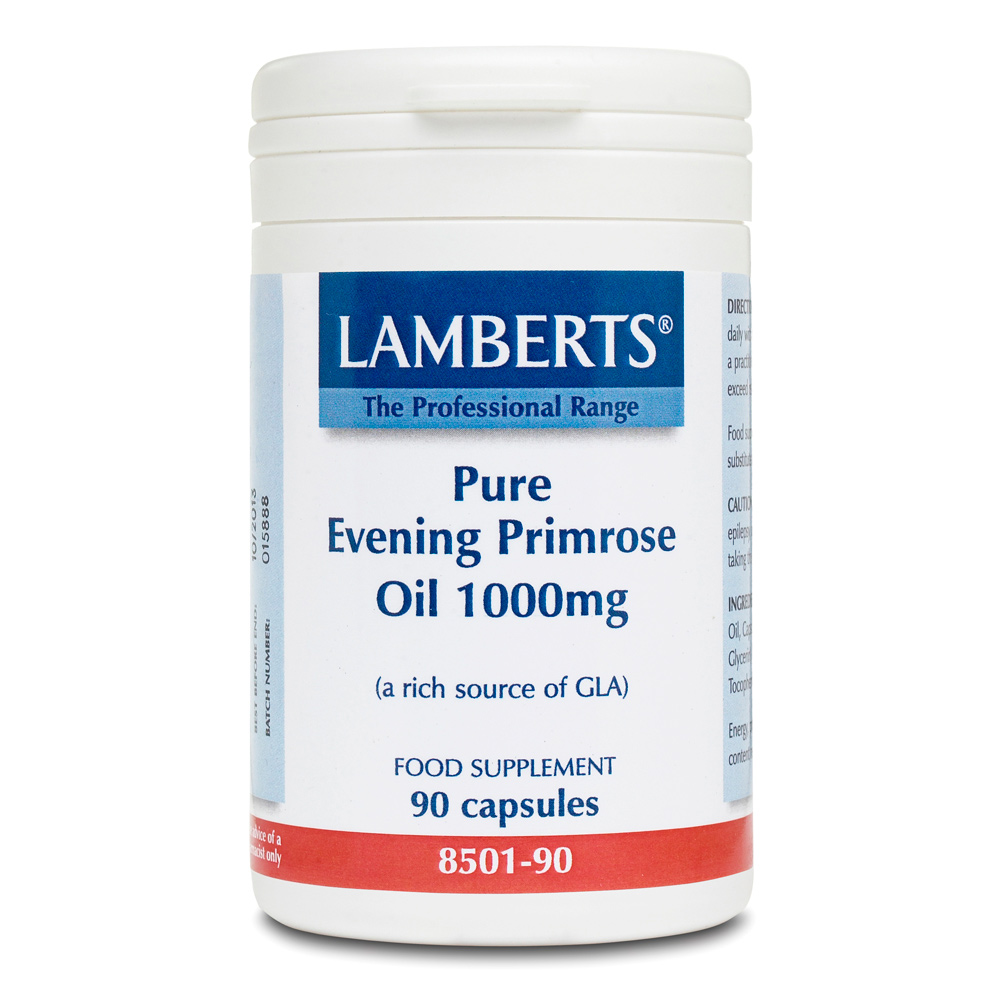 Το Evening Primrose Oil αποτελεί μία από τις λίγες φυσικές πηγές ενός πολυακόρεστου λιπαρού οξέος που ονομάζεται Γ-Λινολεϊκό οξύ (GLA) που αποτελεί την πρόδρομο ουσία μιας ιδιαίτερα σημαντικής προσταγλανδίνης της PGE1, η οποία λαμβάνει μέρος στην ρύθμιση της λειτουργίας του νευρικού, του καρδιαγγειακού και του αναπαραγωγικού συστήματος, στην υγεία του δέρματος και σε πληθώρα άλλων βιολογικών λειτουργιών. Παρά το γεγονός ότι ο οργανισμός δύναται να παράγει GLA από Λινολεϊκό οξύ (το Ωμέγα 6 λιπαρό οξύ που βρίσκεται στα φυτικά έλαια) η μετατροπή αυτή αρκετές φορές επιβραδύνεται ή και αναστέλλεται πλήρως. Για τον λόγο αυτό, μία διαιτητική πηγή GLA μπορεί να είναι χρήσιμη για τον οργανισμό ώστε να παρακαμφθεί η διαδικασία της μετατροπής, κάτι που επιβεβαιώνεται από αρκετές κλινικές μελέτες στις οποίες απεδείχθη όφελος από την λήψη συμπληρωμάτων διατροφής με GLA σε συγκεκριμένες περιπτώσεις. Το Evening Primrose Oil της Lamberts αποτελεί υψηλής ποιότητας έλαιο ειδικά επιλεγμένο για την αγνότητα του και για το επίπεδο της περιεκτικότητας του σε GLA ενώ παρέχει επίσης 10mg Βιταμίνης Ε. Το Lamberts Evening Primrose Oil 1000mg 90caps προτείνεται σε γυναίκες κατά τη διάρκεια της εμμηνόπαυσης, γυναίκες κατά τη διάρκεια της έμμηνου ρύσεως, οποιονδήποτε επιθυμεί να διατηρήσει το δέρμα του σε καλή κατάσταση.