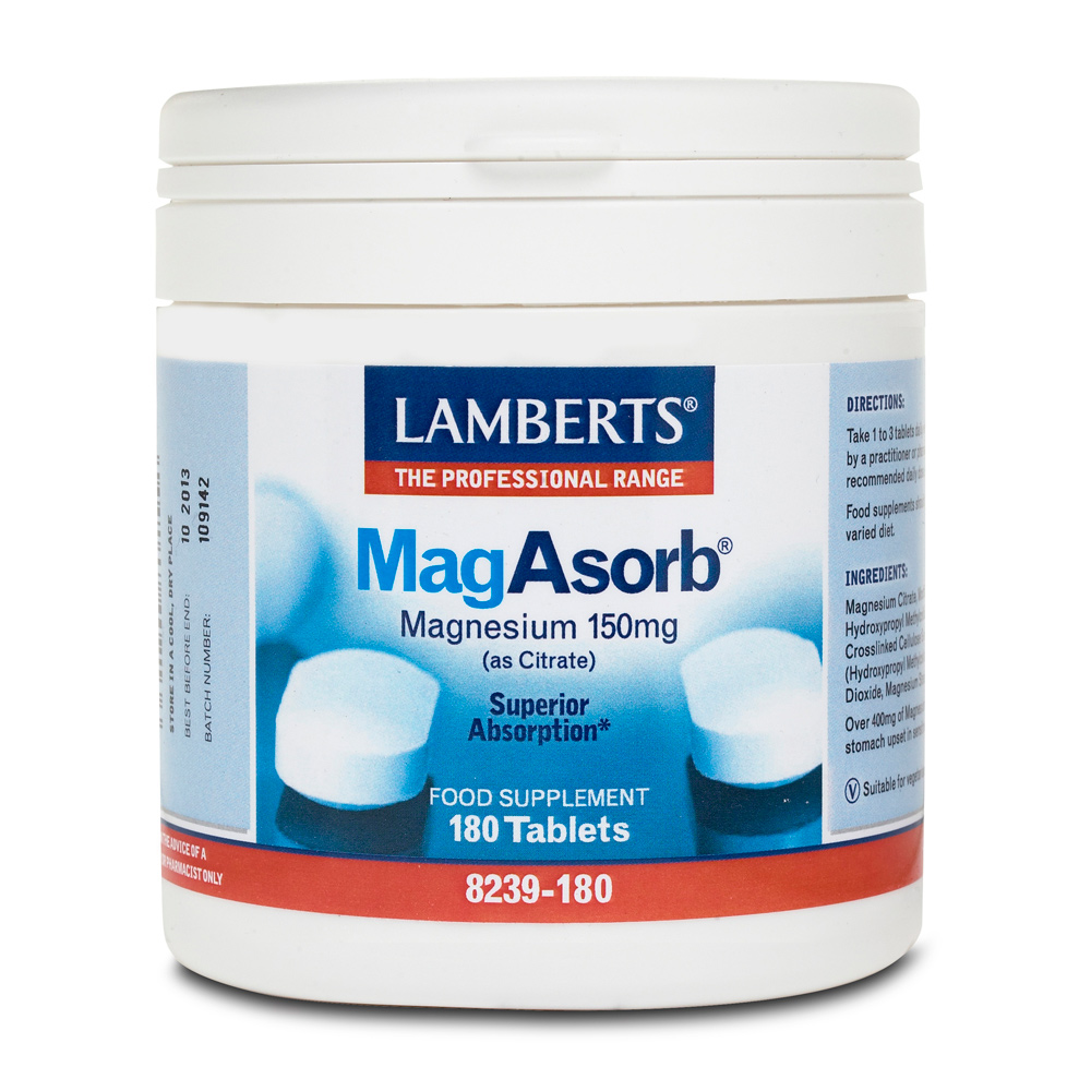 Σύμφωνα με επίσημες έρευνες, μεγάλα μέρη των πληθυσμών δεν λαμβάνουν επαρκείς ποσότητες μαγνησίου μέσω της διατροφής, καθιστώντας την ανεπάρκεια μαγνησίου ευρέως διαδεδομένη στον γενικό πληθυσμό, με συμπτώματα όπως μυϊκές κράμπες, κόπωση και πολλά συμπτώματα του προεμμηνορυσιακού συνδρόμου. Το μέταλλο αυτό είναι απαραίτητο για την ανάπτυξη των οστών και τη σωστή λειτουργία του νευρικού συστήματος και των μυών, κυρίως αυτών της καρδιάς και των πνευμόνων. Τα συμπληρώματα μαγνησίου αποτελούν το ιδανικό μέσο, τόσο για την πρόληψη της ανεπάρκειας του μετάλλου όσο και για την ενίσχυση των αποθηκών του στον οργανισμό, με την προϋπόθεση ότι θα παρέχουν επαρκείς ποσότητες του μετάλλου και ότι θα είναι σε τέτοια φαρμακοτεχνική μορφή ώστε να απορροφάται ευκολότερα. Το MagAsorb της Lamberts παρέχει υψηλής βιοδιαθεσιμότητας μαγνήσιο σε μορφή κιτρικού άλατος για άμεση απορρόφηση.