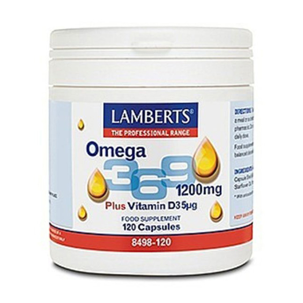 Το Lamberts Omega 3 6 9 120caps παρέχει εξαιρετικά επίπεδα ωμέγα 3, 6 και 9 λιπαρών οξέων ενισχυμένα με προσθήκη 5μg βιταμίνης D3, μιας βιταμίνης γνωστής για την συμβολή της στην ομαλή λειτουργία του ανοσοποιητικού συστήματος. Η μοναδική αυτή φόρμουλα περιέχει ωμέγα 3 λιπαρά οξέα που λαμβάνονται από λιπαρά ψάρια (αντί του λιγότερα απορροφήσιμου alpha linoleic acid που χρησιμοποιείται από πολλές εταιρείες), και κάθε κάψουλα αποδίδει 379mg ω-3 λιπαρών οξέων, εκ των οποίων 196mg ΕΡΑ και 127 mg DHA, ποσότητα η οποία είναι σημαντικά υψηλότερη από την ποσότητα που ανευρίσκεται σε αντίστοιχα προϊόντα άλλων εταιριών. Τα DHA και ΕΡΑ συμβάλλουν στην φυσιολογική λειτουργία της καρδιάς ενώ το DHA συμβάλλει επιπλέον στην διατήρηση της φυσιολογικής όρασης. Η πηγή των ωμέγα-6 λιπαρών οξέος του προϊόντος είναι το έλαιο από starflower (borage) και κάθε κάψουλα αποδίδει 66mg Gamma Linolenic Acid (GLA), και 125mg linoleic acid ενώ έχει επιλεγεί φυσικό ελαιόλαδο ως πηγή του ωμέγα-9 λιπαρού οξέος , με κάθε κάψουλα να αποδίδει μια εντυπωσιακή ποσότητα 200mg ελαϊκού οξέος.