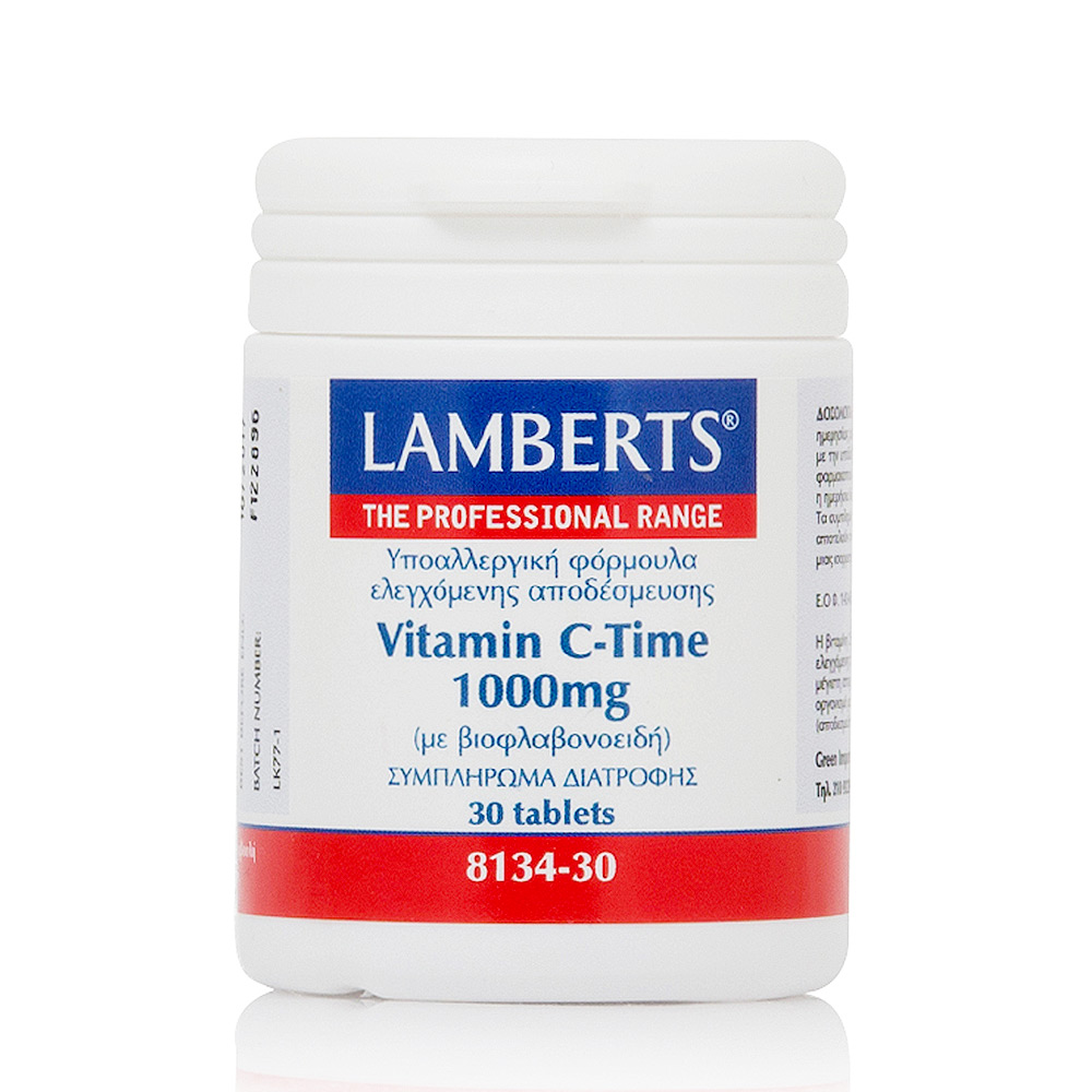 Η Βιταμίνη C είναι απαραίτητη για ένα υγειές ανοσοποιητικό σύστημα, υγιή οστά, δόντια και ούλα καθώς επίσης και στην διατήρηση σε κανονικά επίπεδα της χοληστερόλης του αίματος και οι ανάγκες του οργανισμού σε αυτή είναι μεγαλύτερες από οποιαδήποτε άλλη υδατοδιαλυτή βιταμίνη. Ο ιδανικός τρόπος πρόσληψης της Βιταμίνης C είναι σε μικρές ποσότητες συνεχόμενα κατά τη διάρκεια όλου του εικοσιτετράωρου, όμως κάτι τέτοιο όμως είναι πολύ δύσκολο. Για την επίλυση του προβλήματος αυτού η Lamberts δημιούργησε τις ταμπλέτες Βιταμίνης C Time Release. Οι ταμπλέτες Lamberts Vitamin C Time Release παράγονται μετά από μία ειδική διαδικασία, η οποία διατηρεί τα θρεπτικά στοιχεία σε μικροσφαιρίδια, επιτρέποντάς την σταδιακή απελευθέρωση τους κατόπιν της κατάποσης επιτυγχάνοντας τη σταδιακή και συνεχόμενη απορρόφηση της Βιταμίνης C η οποία διαρκεί για περίπου 6 με 8 ώρες. Εκτός αυτού η Βιταμίνη C βαθμιαίας απελευθέρωσης της Lamberts, περιέχει και μία σημαντική ποσότητα βιοφλαβονοειδών τα οποία συμβάλλουν στην απορρόφησή της από τον οργανισμό καθώς έχει αποδειχθεί ότι τα βιοφλαβονοειδή διαθέτουν συγκεκριμένες βιολογικές ιδιότητες, μία εκ των οποίων είναι η ενίσχυση του τοιχώματος των τριχοειδών αγγείων. Συγκεκριμένα περιέχονται στο συγκεκριμένο σκεύασμα περιλαμβάνουν rutin, quercetin, citrin και hesperidin.
