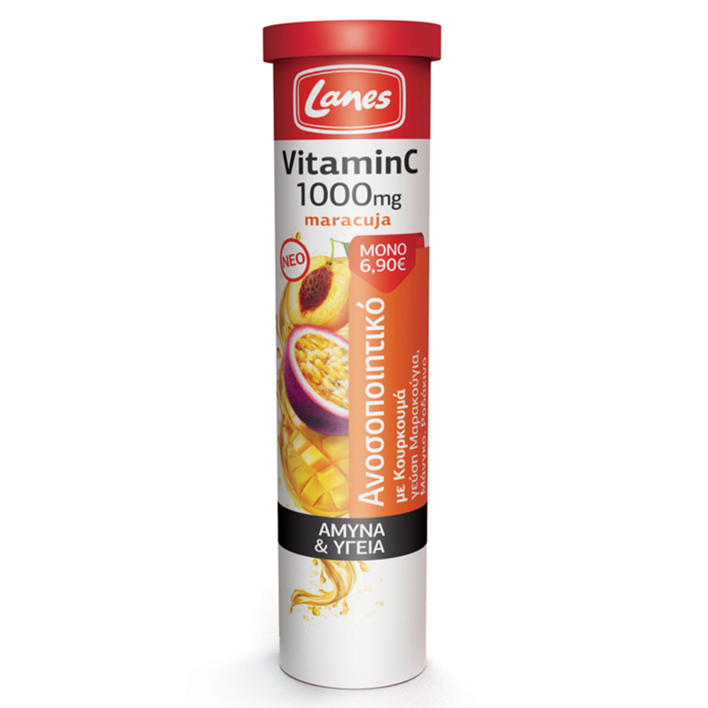 Συμπλήρωμα Vitamin C 1000mg Maracuja της Lanes διατροφής με υπέροχη γεύση μαρακούγια, μάνγκο και ροδάκινο, ενισχύει το ανοσοποιητικό σύστημα και συμβάλλει στην αντιμετώπιση ιώσεων και κρυολογημάτων.