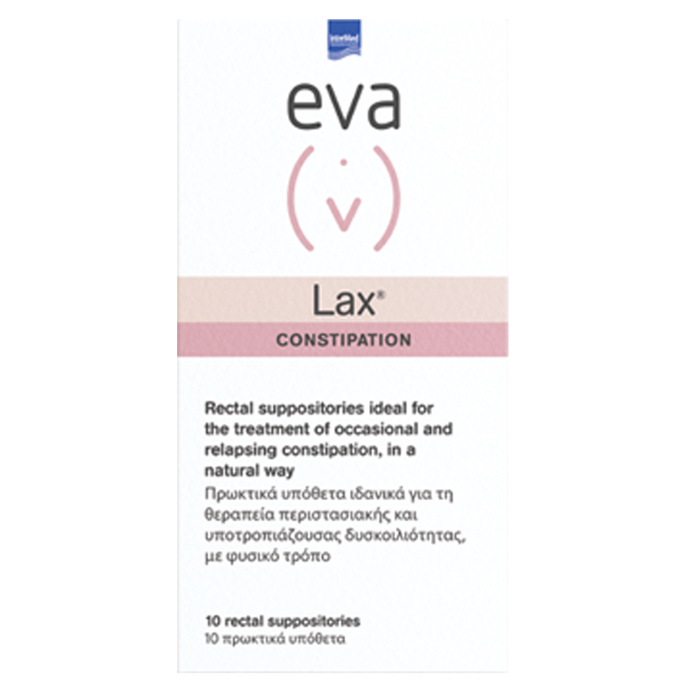 Τα EVA LAX είναι ειδικά σχεδιασμένα πρωκτικά υπόθετα με αναβράζουσα δράση τα οποία διευκολύνουν την απομάκρυνση των ενσφηνωμένων κοπράνων με τον πιο εύκολο και ανώδυνο τρόπο χάρη στις μικροφυσαλίδες που απελευθερώνουν σταδιακά. Παράλληλα με το εκχύλισμα χαμομηλιού που περιέχουν ανακουφίζουν άμεσα τον ερεθισμένο εντερικό αυλό και μειώνουν το αίσθημα καύσου & πόνου στο σφικτήρα του πρωκτού.