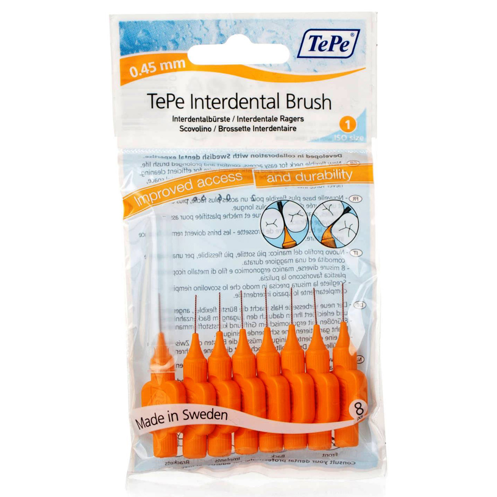 Τα μεσοδόντια βουρτσάκια TePe έχουν εργονομική λαβή που τα καθιστά πιο εύχρηστα και πρακτικά. Το μεταλλικό τμήμα τους είναι πλαστικοποιημένο για μεγαλύτερη άνεση και αποφυγή γαλβανικού ρεύματος αλλά και οποιασδήποτε βλάβης των εμφυτευμάτων. Κάθε συσκευασία περιλαμβάνει 8 μεσοδόντια βουρτσάκια TePe και ένα πλαστικό καπάκι που χρησιμοποιείται για να προστατεύει το βουρτσάκι αλλά και για να επιμηκύνει τη λαβή. Είναι διαθέσιμα σε εννιά χρωματικούς κωδικούς – μεγέθη. Τόσο η λαβή όσο και η συσκευασία που διαθέτουν τα μεσοδόντια βουρτσάκια TePe είναι κατασκευασμένες από φιλικά προς το περιβάλλον πλαστικά.