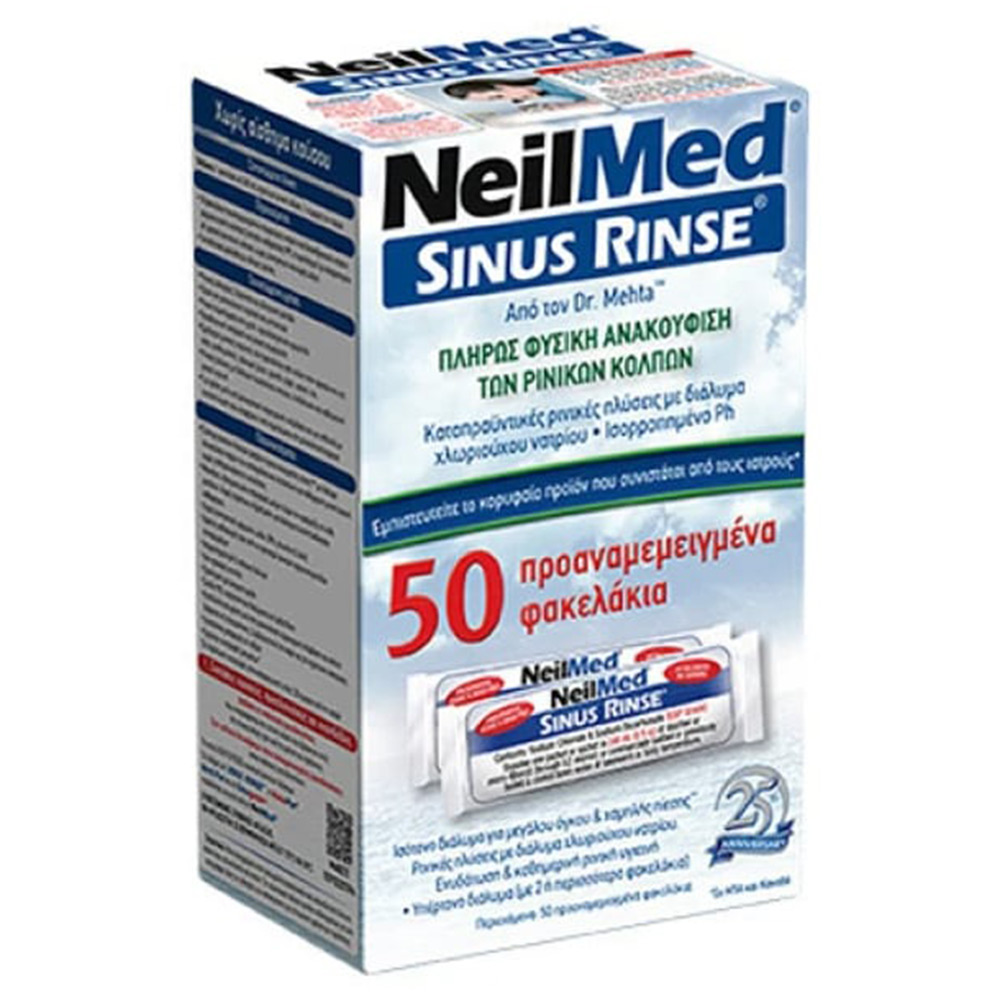 Σύστημα ρινικών πλύσεων με 50 φακελάκια αλατούχου σκόνης. Απομακρύνει βλέννα, σκόνη και αλλεργιογόνα και διατηρεί το pH ισορροπημένο για καθημερινή άνεση.