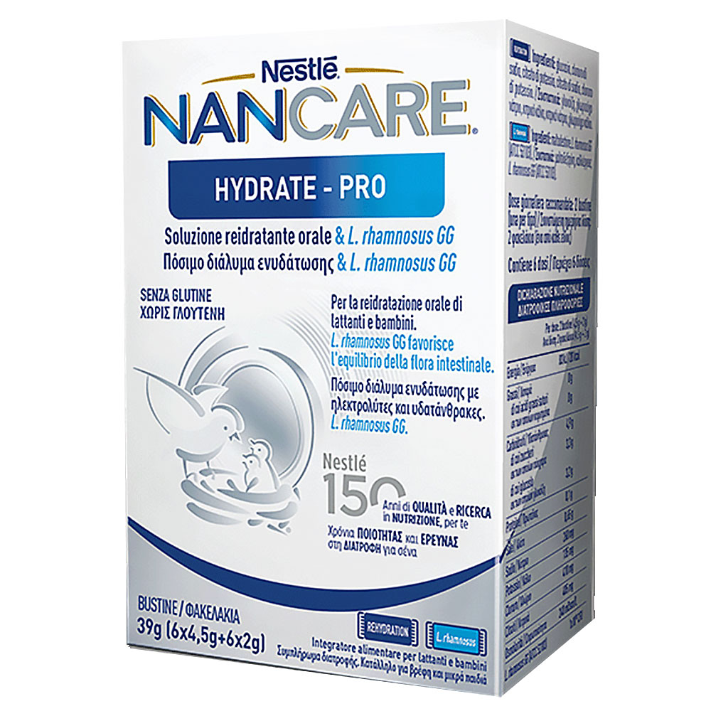 Το συμπλήρωμα διατροφής Nancare Hydrate Pro της Nestle συνδυάζει ένα πόσιμο διάλυμα ηλεκτρολυτών και υδατανθράκων για ενυδάτωση και ενεργές καλλιέργειες L.rhamnosus GG.