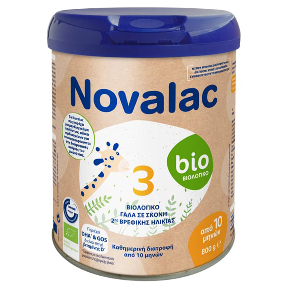 Novalac Bio 3 800g βρεφικό γάλα 3ης βρεφικής ηλικίας, από πιστοποιημένη βιολογική παραγωγή, κατάλληλο για χρήση στο πλαίσιο ποικίλης διατροφής για βρέφη άνω των 12 μηνών.