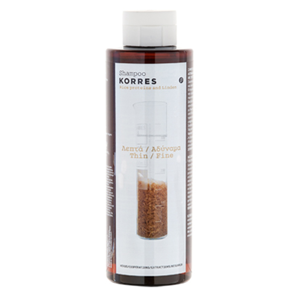 Το Σαμπουάν με Πρωτεΐνες Ρυζιού και Τίλιο της Korres δυναμώνει και δίνει όγκο στα μαλλιά. Η σύνθεσή του περιέχει εκχυλίσματα από δίκταμο, ματζουράνα και τσάι του βουνού, καθώς και πρωτεΐνες ρυζιού, οι οποίες ενισχύουν την ελαστικότητα και την πυκνότητα της τρίχας βοηθώντας τα μαλλιά να αποκτήσουν φυσικό όγκο με διάρκεια, και εκχύλισμα από Τίλιο, που σχηματίζει ένα προστατευτικό φιλμ στην επιφάνεια της τρίχας βοηθώντας τα μαλλιά να δείχνουν πιο υγιή και λαμπερά.