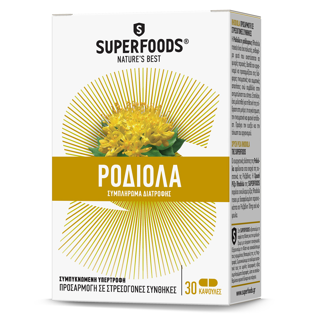 Νιώθετε στρες; Η Χρυσή ρίζα Rodhiola™ της SuperFoods είναι εδώ για εσάς. Η χρυσή ρίζα (Rhodiola, Rhodiola rosea) έχει κατηγοριοποιηθεί ως προσαρμογόνο από Ρώσους ερευνητές, καθώς έχει παρατηρηθεί ότι έχει την ικανότητα να αυξάνει την αντίσταση του οργανισμού σε διάφορα είδη στρες. Η Rhodiola κατέχει ιδιότητες οι οποίες βοηθούν τα άτομα να αντιμετωπίζουν κάποιες καθημερινές καταστάσεις. Οι έρευνες καταδεικνύουν την χρησιμότητά της στους πνεύμονες το νευρικό σύστημα και σε περιπτώσεις ατονίας (μείωση της απόδοσης στην εργασία, δυσκολία στον ύπνο, μειωμένη όρεξη, ευερεθιστικότητα, υπέρταση, κεφαλαλγίες & κόπωση), που προκύπτουν από έντονη φυσική ή πνευματική καταπόνηση.