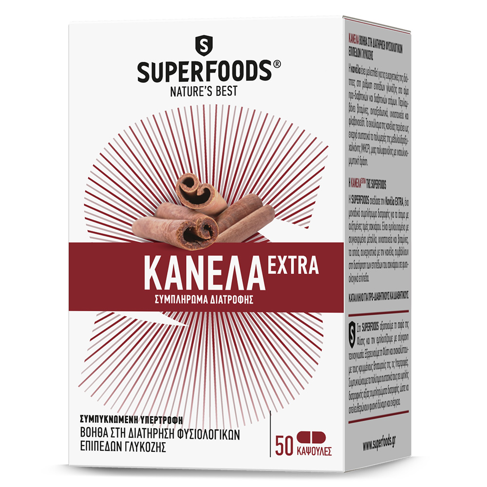 Η SUPERFOODS σχεδίασε την Κανέλα EXTRA, ένα μοναδικό συμπλήρωμα διατροφής για τα άτομα με αυξημένες τιμές σακχάρου. Είναι εμπλουτισμένο με συγκεκριμένα μέταλλα, ιχνοστοιχεία και βιταμίνες, τα οποία, συνεργιστικά με την κανέλα, συμβάλλουν στη διατήρηση των επιπέδων του σακχάρου σε φυσιολογικά επίπεδα.