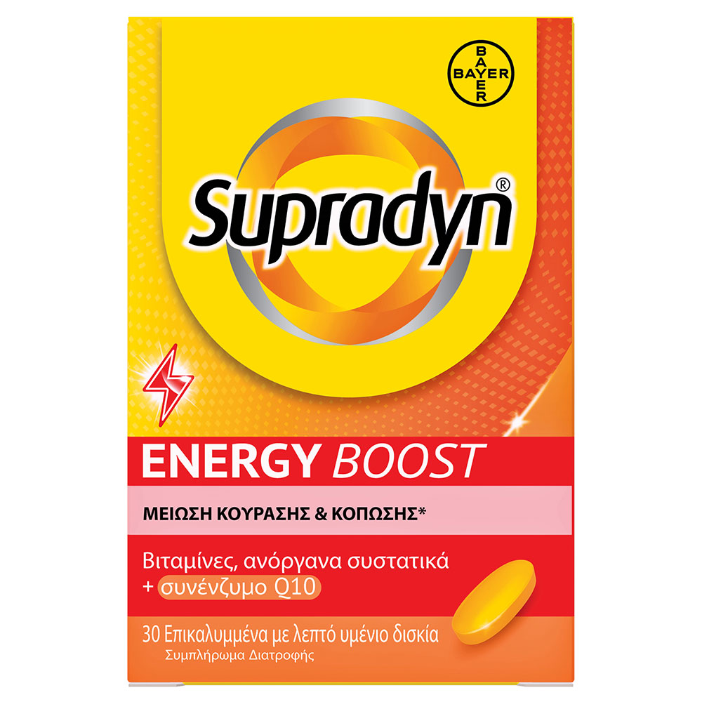 Το συμπλήρωμα διατροφής Supradyn Energy Boost της Bayer περιέχει 13 βιταμίνες, 9 μέταλλα και ιχνοστοιχεία καθώς και το συνένζυμο Q10.